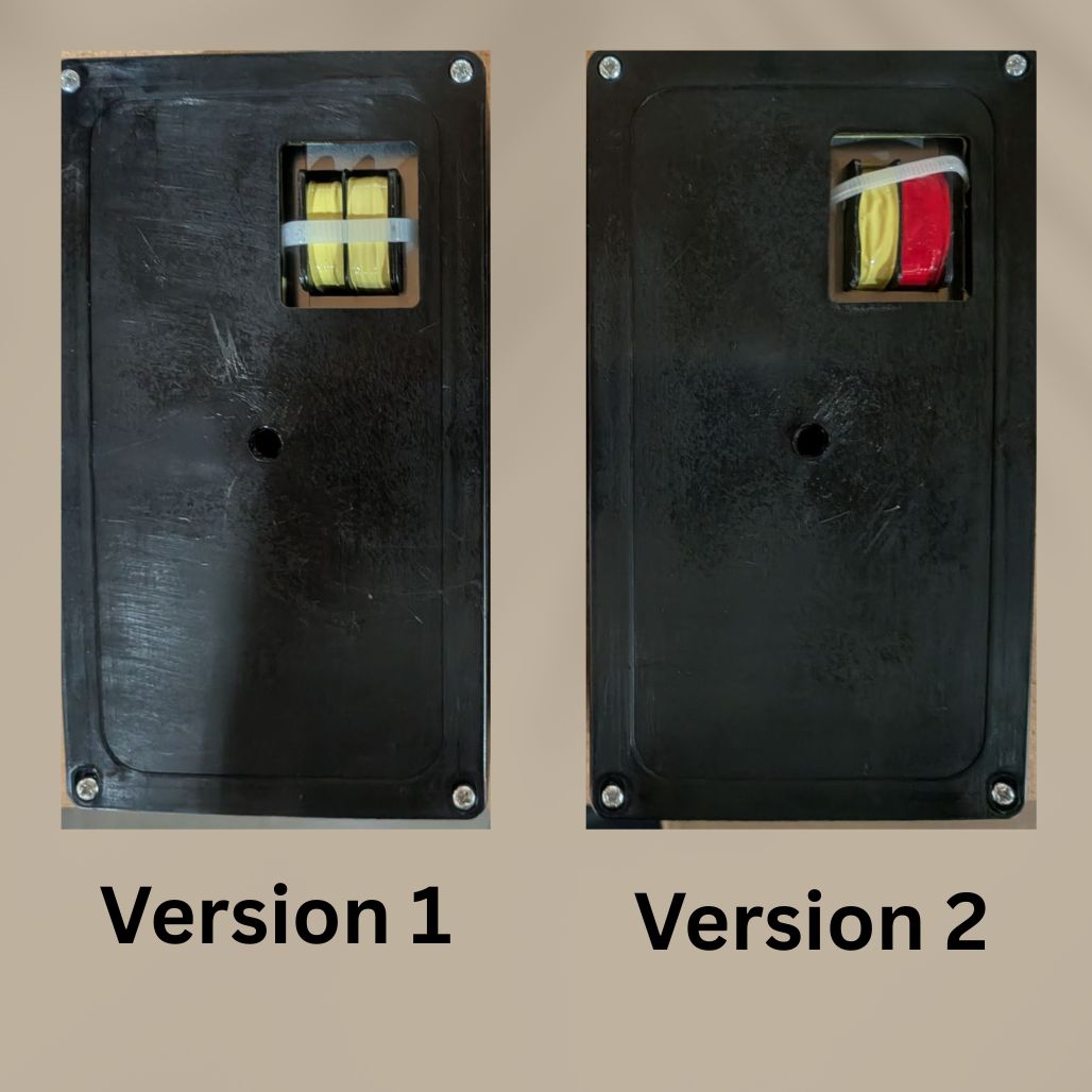 Both versions are housed in a black plastic enclosure with a removable lid. The transformer color—visible through the square cutout window on the lid—is the key compatibility indicator.